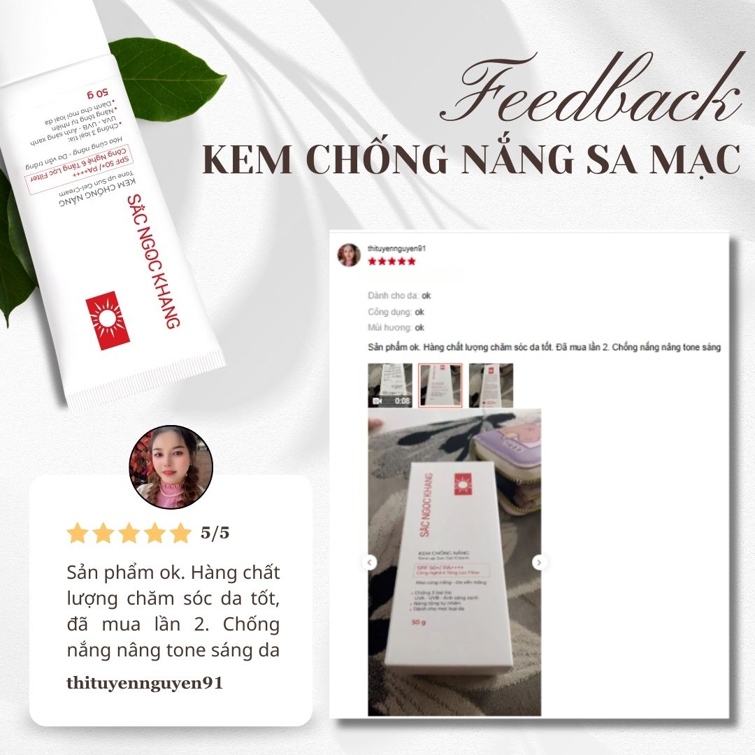Kem Chống Nắng “Sa Mạc” của Sắc Ngọc Khang còn được bổ sung thêm Antileukine 6 từ Rong Biển Vàng nước Pháp (sinh vật với khả năng cân bằng và thích ứng đáng kinh ngạc với môi trường biển căng thẳng và tia cực tím cực cao). Nhờ đó mà siêu phẩm càng trở nên quyền lực hơn khi có thể làm dịu da tức thì trước cái nắng gay gắt; củng cố cấu trúc da và giúp làm chậm quá trình lão hóa.