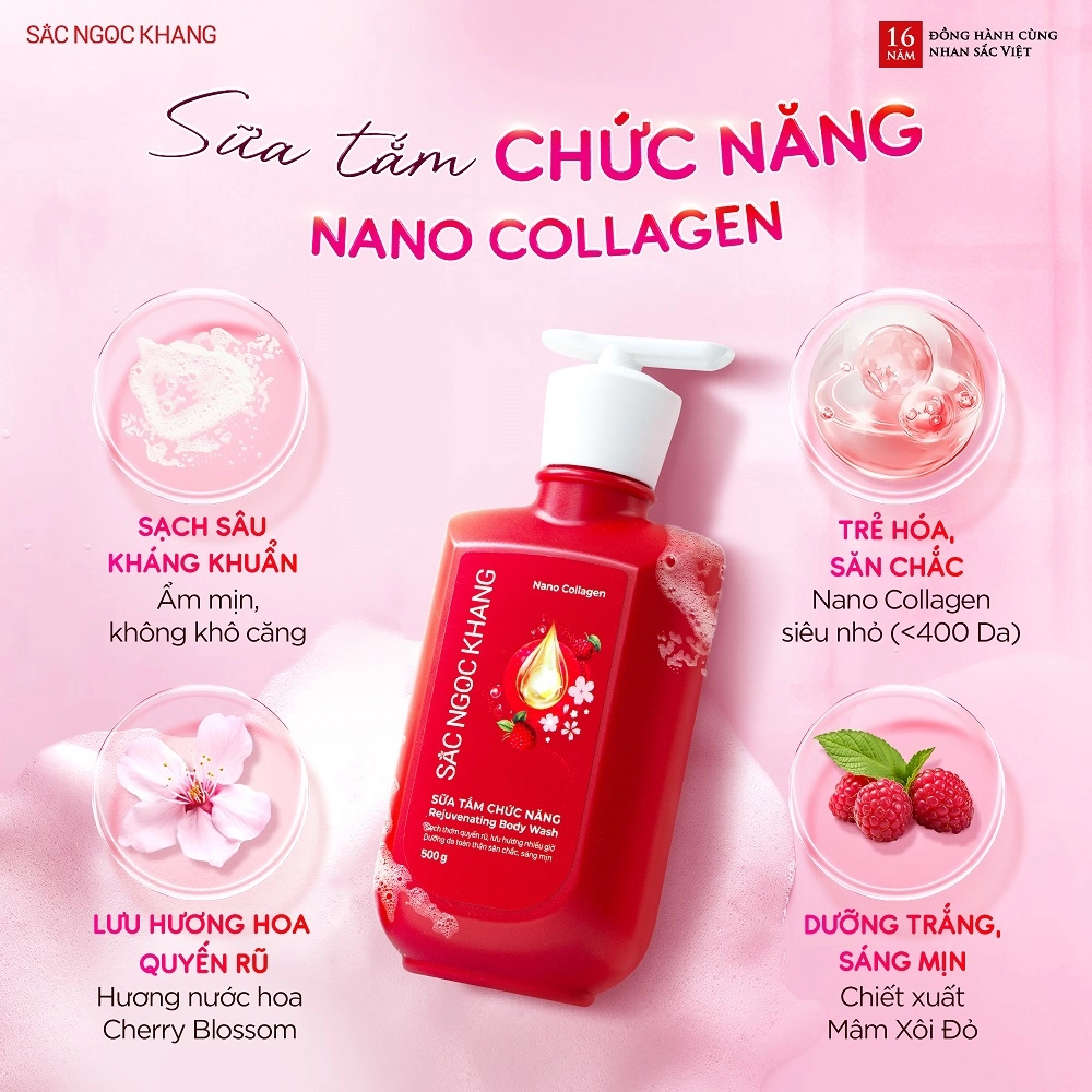 Đừng để làn da của bạn phải chịu “thiệt thòi” thêm nữa! Sữa Tắm Chức Năng Sắc Ngọc Khang sẽ đưa bạn bước vào hành trình chăm sóc da hoàn hảo. Nhờ vào sức mạnh từ công thức độc đáo kết hợp Nano Collagen, chiết xuất Mâm Xôi Đỏ mang đến làn da săn chắc, trắng mịn và tràn đầy sức sống. Đặc biệt, hương nước hoa Cherry Blossom, mang đến mùi hương nhẹ nhàng, quyến rũ, giúp lưu hương dài lâu, làm say mê mọi giác quan, đánh thức từng tế bào.